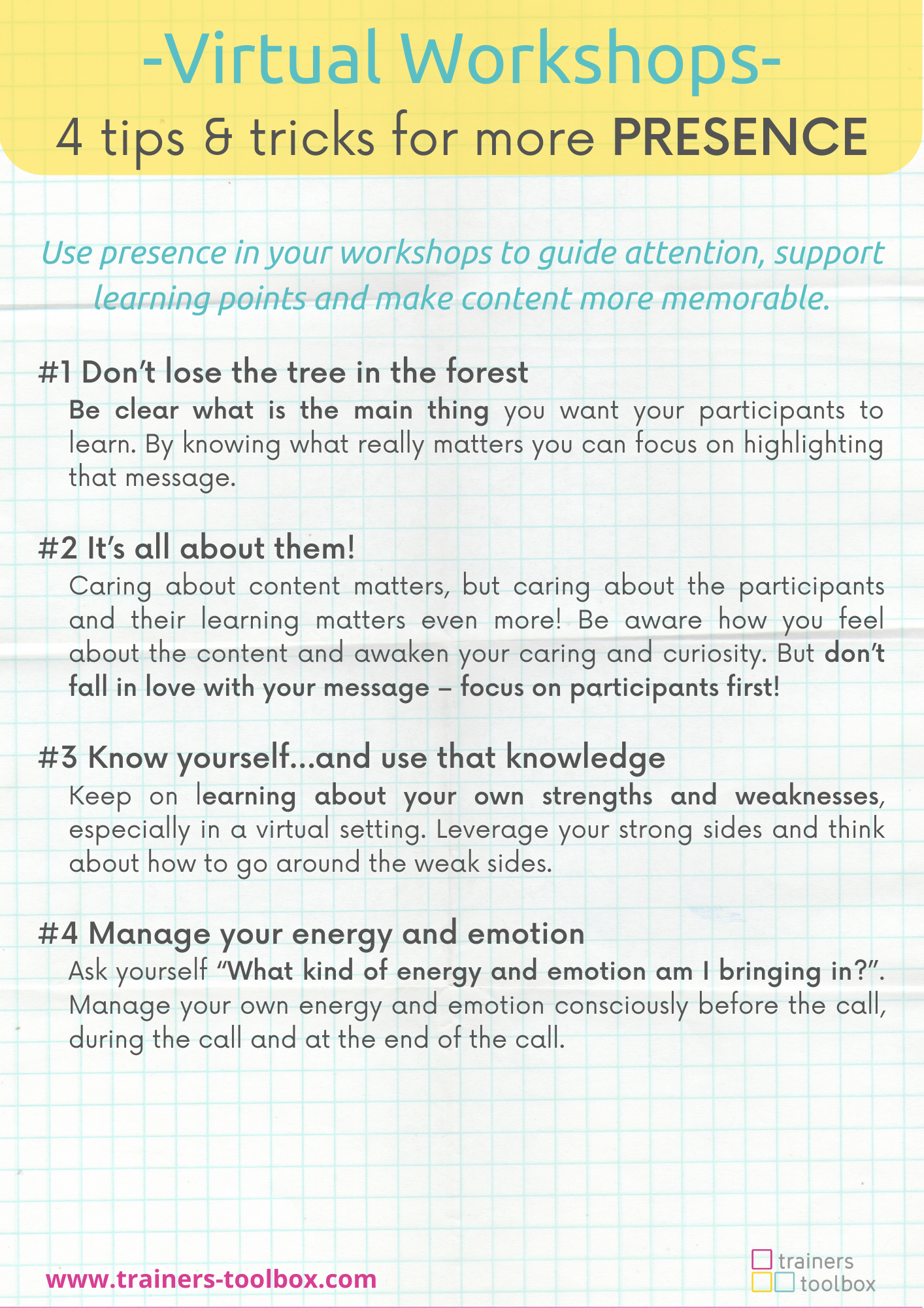 Here are 4 tips & tricks (more clearly explained in the free webinar) to use personal presence in your workshops to guide participants’ attention, support learning points and make content more memorable.